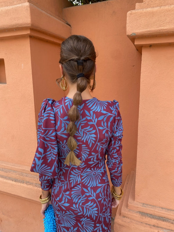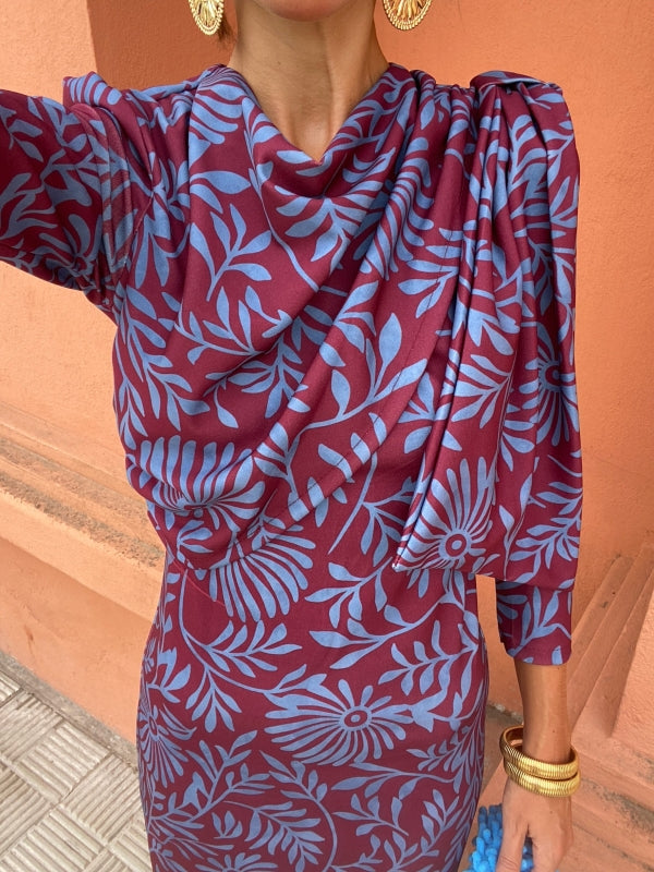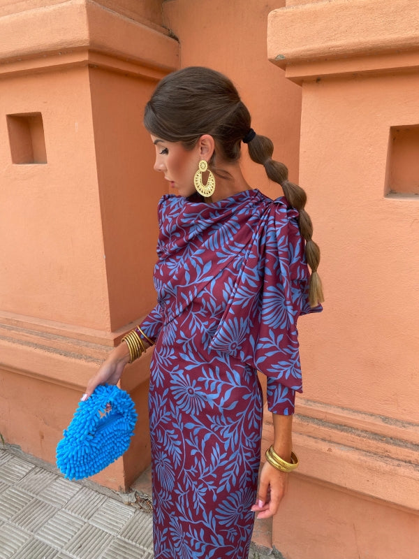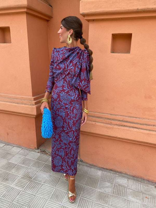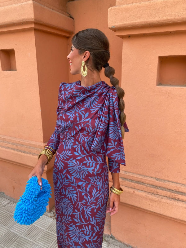 The guest dress features a fitted midi silhouette with a floral print in shades of blue and maroon. The top features an asymmetrical long sleeve design and a bow detail on the shoulder that creates a drape that falls gracefully down the body.