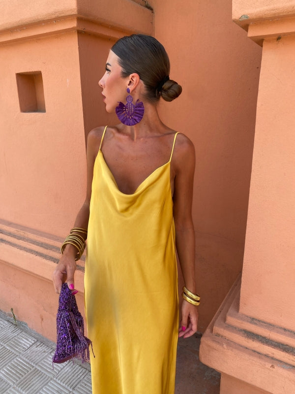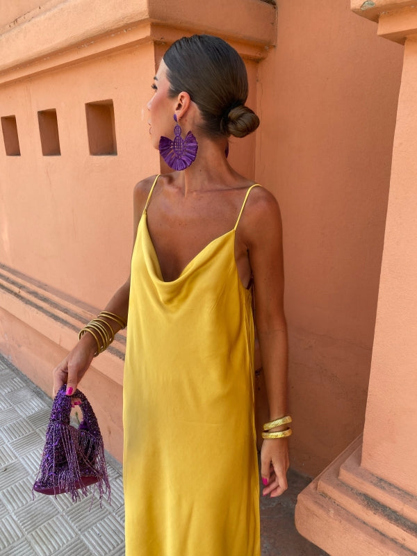 Its delicate thin straps gracefully accentuate the shoulders, while the dress's cut floats lightly, gently adapting to the body without constricting. The exceptional comfort and impeccable drape make it the perfect choice for an unforgettable event where color will take center stage.