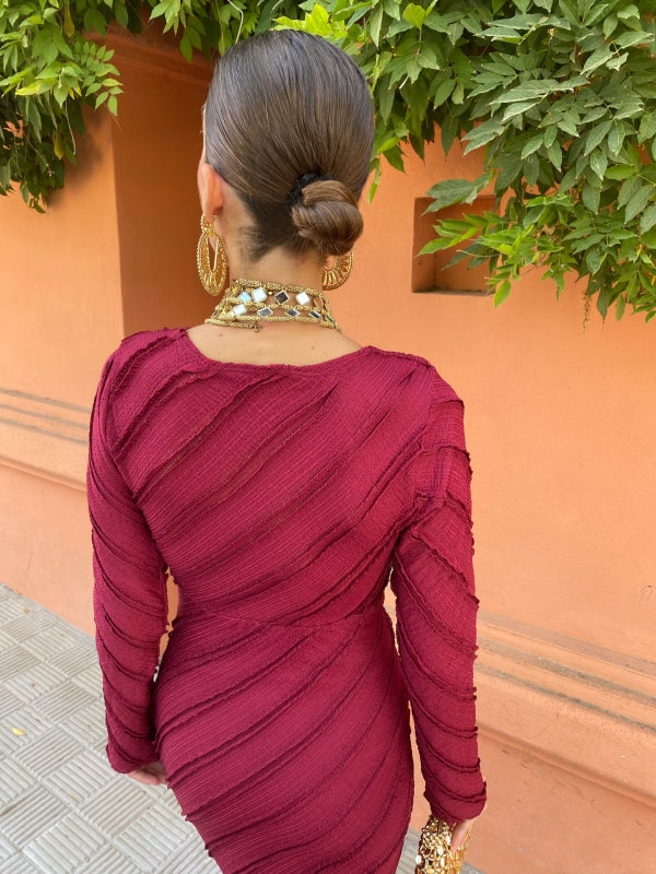 The design is accentuated by a flattering deep V-neck that slims the figure, while the long, close-fitting sleeves ensure impeccable style. The silhouette fits the body perfectly, creating a slim and elegant effect. This dress is the ideal choice for any special occasion, offering a perfect combination of design and comfort.