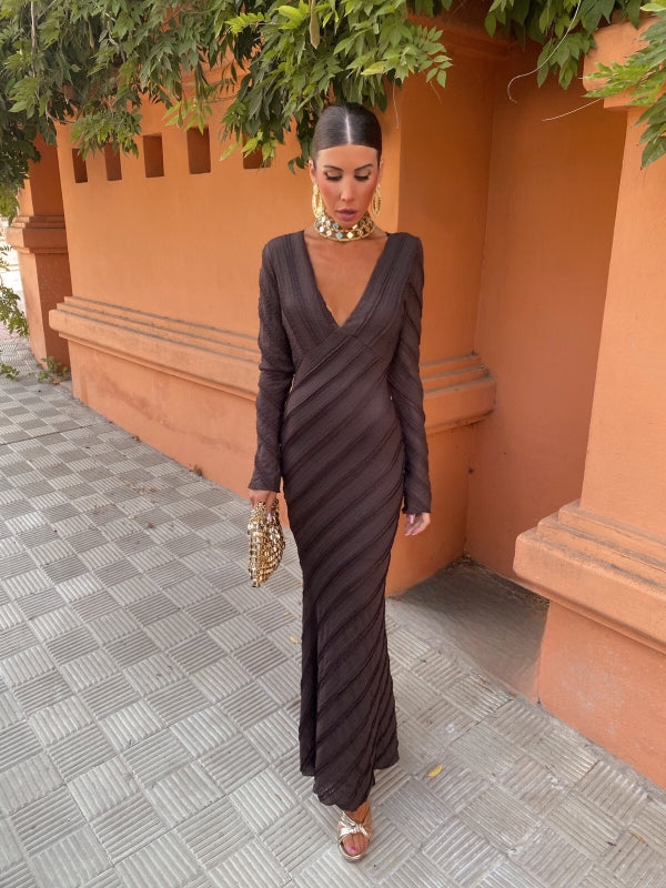 A guest dress made from a fabric with a ribbed embossed texture running in diagonal lines, creating a modern and visually appealing look. The dark brown color of this long, fitted dress gives it a classic and timeless elegance, perfect for a special occasion wardrobe.