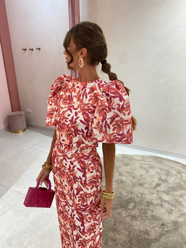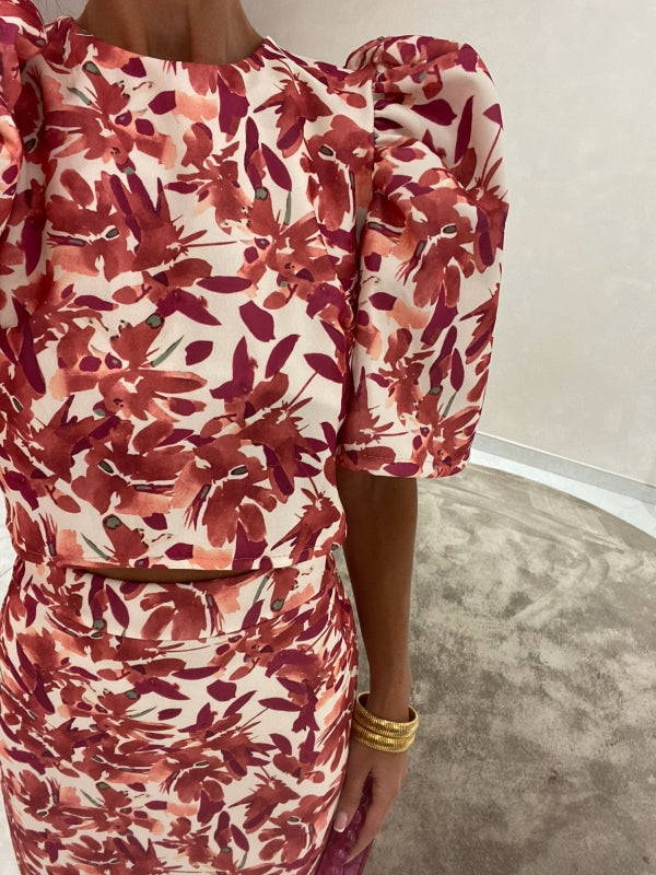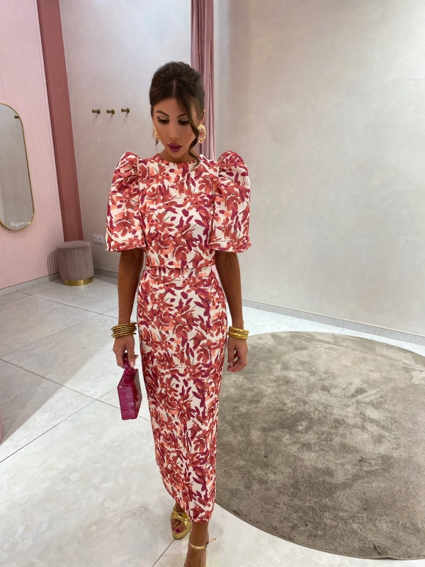 The round neckline top features feminine puffed short sleeves and fits perfectly thanks to an invisible zipper in the back. The straight cut skirt slims the figure and features a practical back slit. Its elegant floral print in pink and coral tones brings a feminine and elegant touch to your closet.