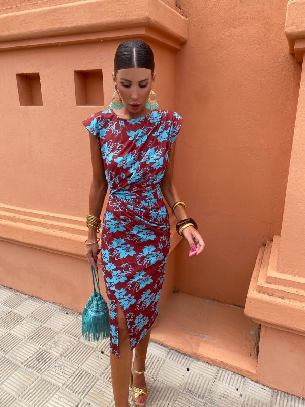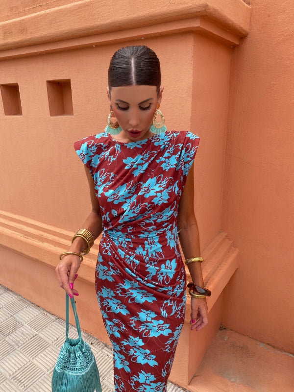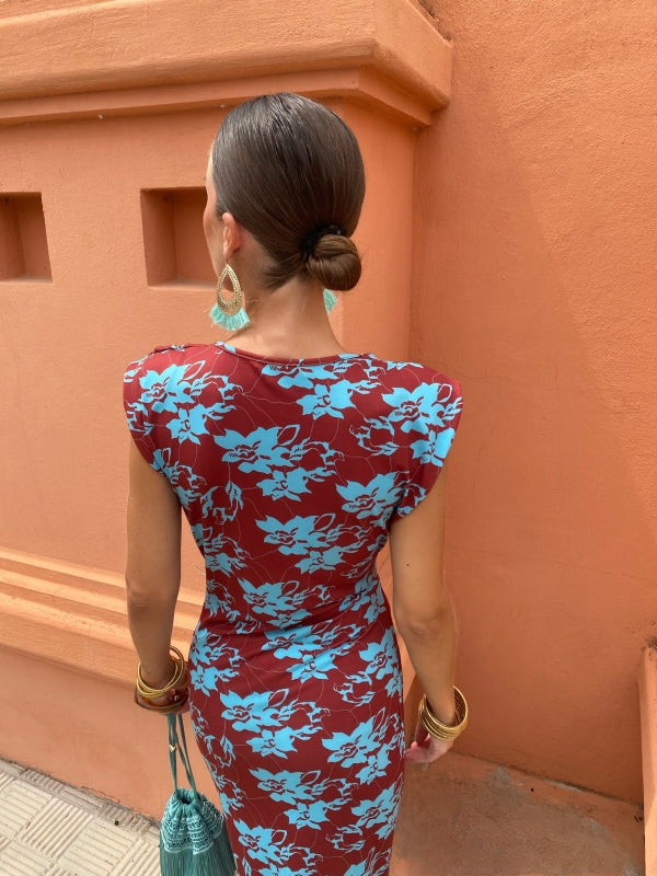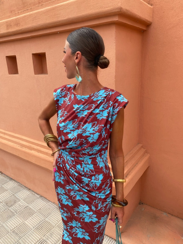 Discover our Alma Dress, a striking piece that combines a rich background with a vibrant floral print.
